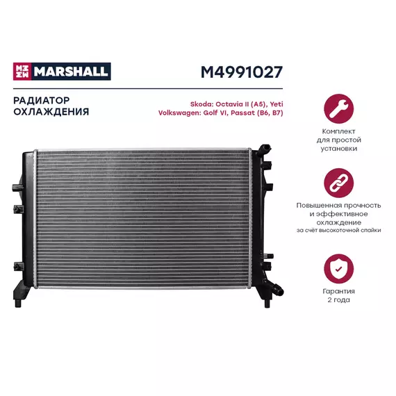Радиатор охлаждения MARSHALL M4991027 Skoda: Octavia II (A5), Yeti Volkswagen: Golf VI, Passat (B6, B7); кросс-номер Nissens 65294; OEM 1K0121251BN